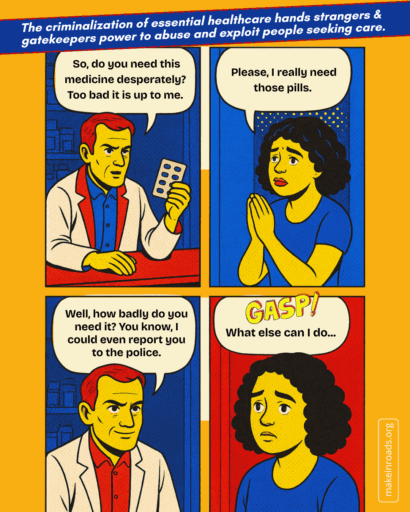 To help reach those audiences, we created these shareable & translatable illustrations of moments many survivors have lived through when trying to access abortion healthcare.
